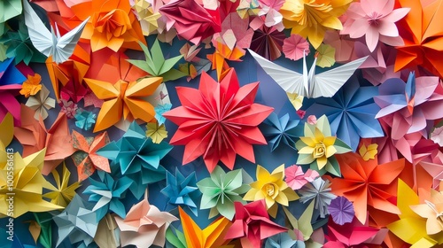 A vibrant display of origami creations made from colorful paper, including cranes, flowers, and geometric shapes.