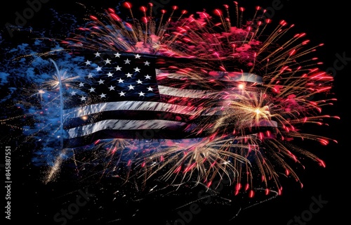 A vibrant display of red, white and blue fireworks forming the American flag in the night sky Generative AI