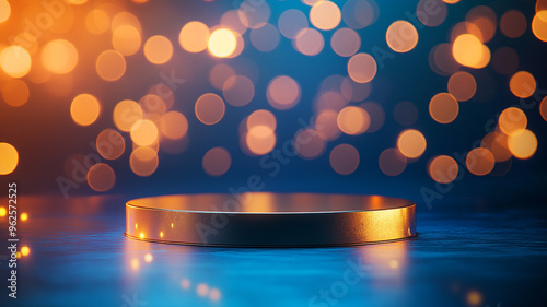 A vibrant display platform set against a bokeh background with warm lighting effects