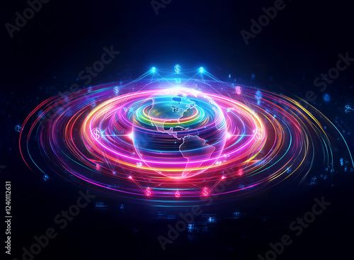 A vibrant double exposure image depicts a glowing Earth encircled by bright, multicolored rings of light, suggesting global connection and digital technology.