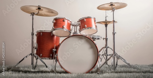 A vibrant drum set featuring a bass drum, snare, and cymbals, set against a minimalist background, showcasing craftsmanship and musical potential.
