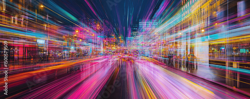 A vibrant, dynamic cityscape at night, depicted with motion blur, showcasing streaks of colorful light emanating from buildings and vehicles, creating an impression of speed and energy