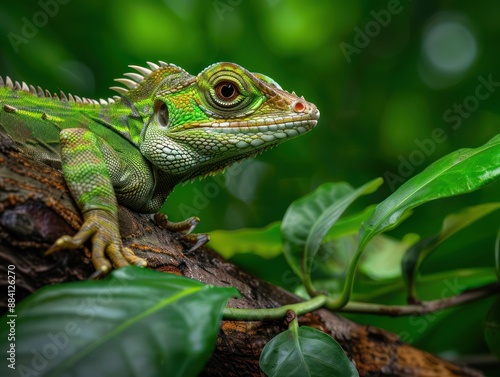A Vibrant Ecosystem A Green Lizard Perched on a Branch, Surrounded by Lush Greenery, Demonstrating the Harmony of Nature and the Importance of Biodiversity