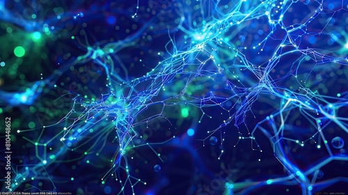 A vibrant electric plexus of blue and green connections sprawling across a midnight blue backdrop designed to look three-dimensional with a focused area for text placement in the lower left corner