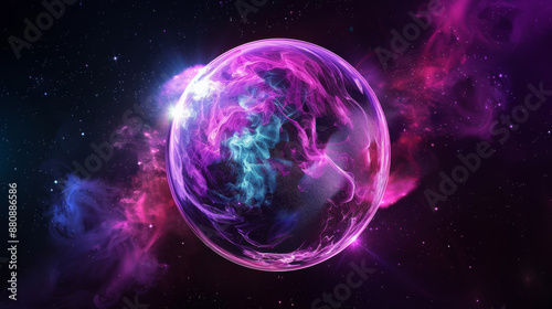 A vibrant, ethereal sphere of swirling purple and blue colors floats against a backdrop of stars, embodying the mystique and wonder of the universe.