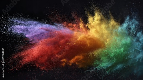 A vibrant explosion of colorful powder paints a vivid spectrum against a stark black backdrop with