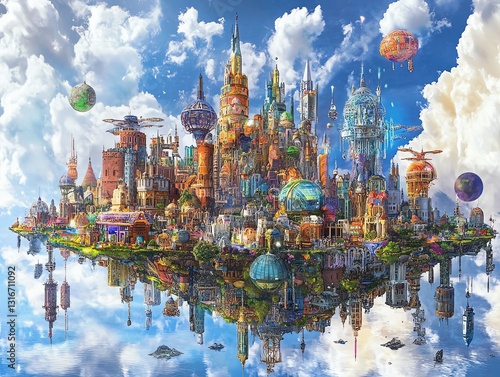 A vibrant, fantastical floating city in the clouds, showcasing diverse architectural styles and whimsical flying vehicles. Perfect for fantasy, imagination, and escapism themes.
