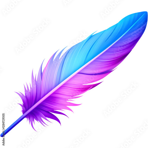 A vibrant feather showcasing a blend of blue and purple hues, characterized by intricate details and soft, flowing textures. Isolated on transparent white background.