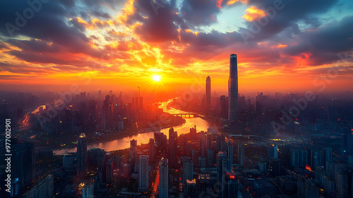 A vibrant, fiery sunset casts a warm glow over a sprawling city skyline, with a winding river and a towering skyscraper reaching towards the sky.