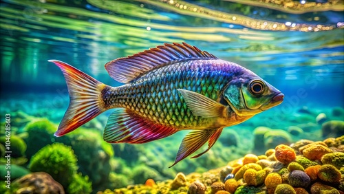 A vibrant fish with iridescent scales swims through a shallow underwater world, its fins shimmering with an array of colors