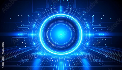 A vibrant, futuristic design showcases a central glowing circle surrounded by intricate digital circuitry.