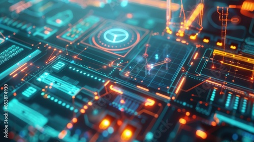 A vibrant, futuristic digital interface with glowing lights and intricate circuit patterns, depicting advanced technology and innovation.