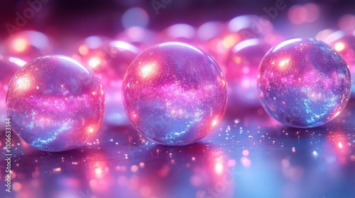 A vibrant, futuristic scene featuring glowing, translucent spheres reflecting light in a cosmic setting.