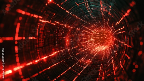 A vibrant, futuristic tunnel with glowing red lights and dynamic patterns.