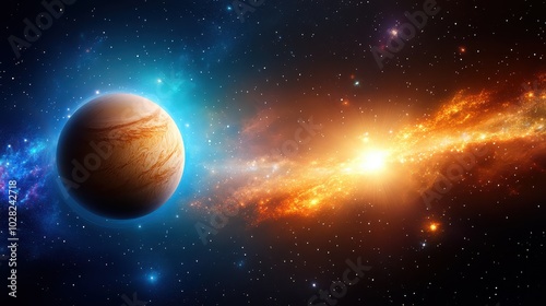A vibrant galaxy with a detailed planet and swirling nebulas in a cosmic landscape full of stars.