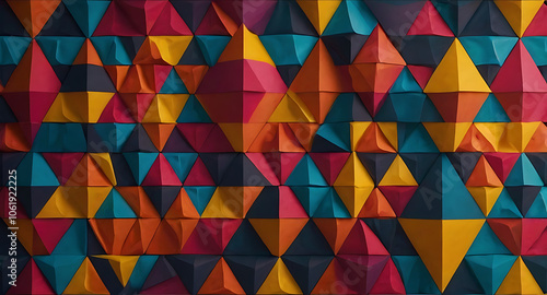 A vibrant geometric pattern made up of colorful triangles and circles, arranged in a dynamic layout that conveys energy and creativity, ideal for a youthful brand or product.