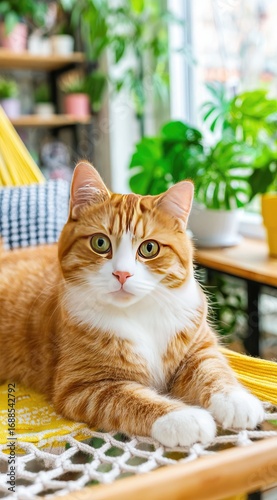 A vibrant ginger cat rests in a woven hammock, surrounded by lush indoor plants, bright window light, and blurred shelves. A cozy, peaceful scene