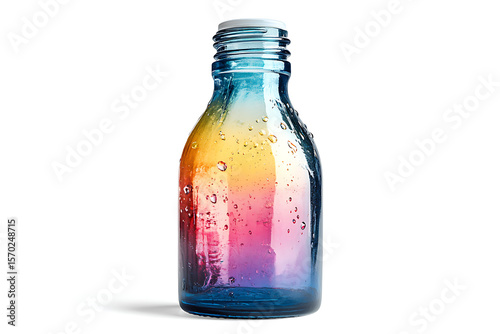 A vibrant glass bottle showcases a rainbow gradient with water droplets, perfect for illustrating creativity or hydration concepts on a clean white background.