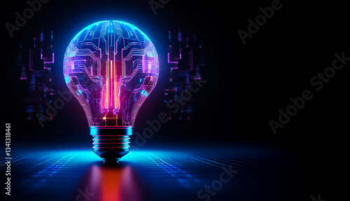 A vibrant, glowing lightbulb with intricate circuit board patterns illuminates the dark scene. Neon lines emanate from the base, creating a futuristic and technological atmosphere.