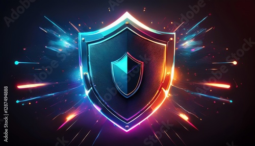 A vibrant, glowing shield design with colorful bursts, symbolizing protection and security in a digital context.
