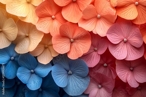 A vibrant gradient of hydrangea blossoms in various colors