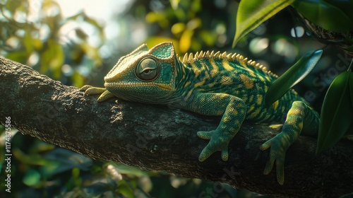 A vibrant green and blue lizard resting on a branch, blending harmoniously with its leafy surroundings.