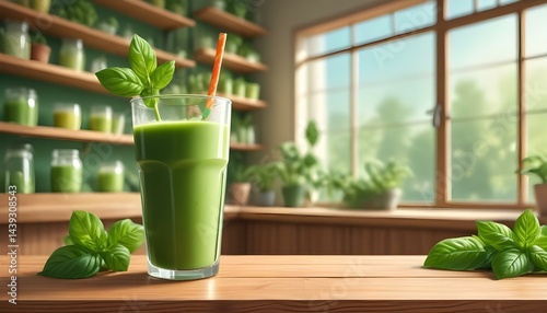A vibrant green basil smoothie is served in a glass, decorated with fresh leaves.