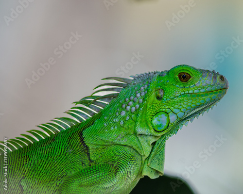 A vibrant green iguana basks in the sun, its scales glistening in the warm Florida Keys breeze. Surrounded by lush vegetation, this striking reptile embodies the natural beauty of the region.