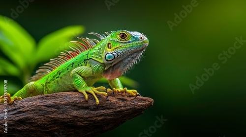A vibrant green iguana perched on a branch, showcasing its unique features and environment.