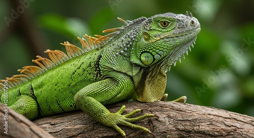 A vibrant green iguana resting on a tree branch, showcasing its textured scales, spines, and sharp claws, with a lush green background.