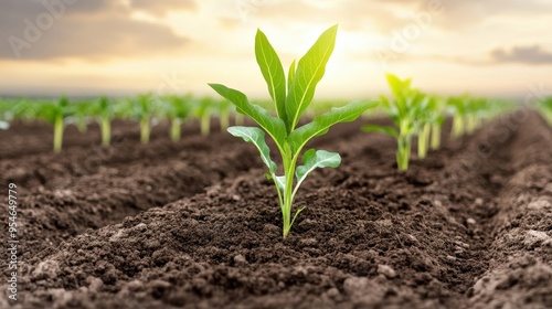A vibrant green plant emerging from rich soil under a beautiful sunset, symbolizing growth and new beginnings in nature.