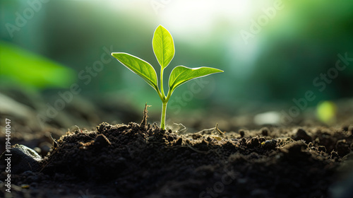 A vibrant green seedling emerges from rich soil, bathed in the warm glow of morning sunlight, symbolizing new growth and the promise of