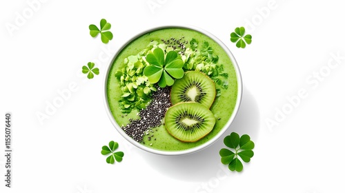 A vibrant green smoothie bowl topped with kiwi, chia seeds, avocado, and clover leaves, showcasing a fresh and healthy aesthetic.