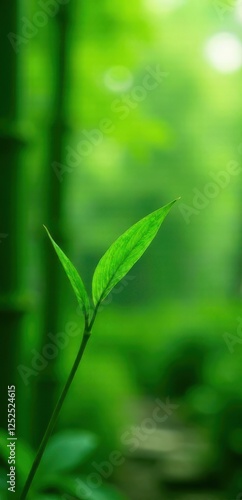 A vibrant green sprout emerges, showcasing new life against a softly blurred backdrop of verdant foliage