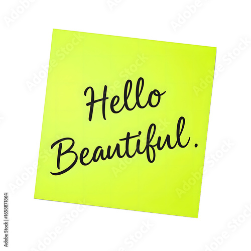 A vibrant green sticky note with Hello Beautiful in charming cursive perfect for uplifting and positive messages, isolated