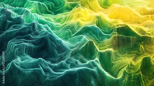 A vibrant green to yellow gradient flowing through a vast, abstract digital landscape.