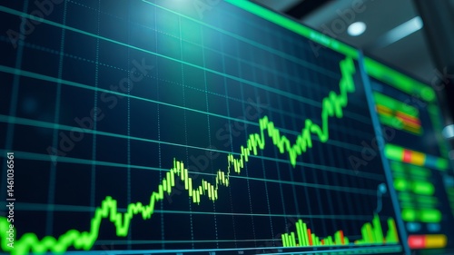 A vibrant green upward trending stock market graph displayed on a large computer monitor screen showing financial growth and success.
