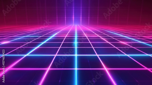 A vibrant grid of neon blue and pink lines creates a retro-futuristic atmosphere, evoking a sense of digital space.