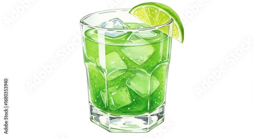 A vibrant, hand-drawn illustration of a refreshing green cocktail in a glass, complete with ice cubes and a lime wedge, showcasing a cool and cheerful mood.