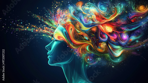 A vibrant human head filled with colorful swirling ideas and emotions, showcasing blend of creativity and imagination. dynamic colors and patterns represent flow of thoughts and inspiration