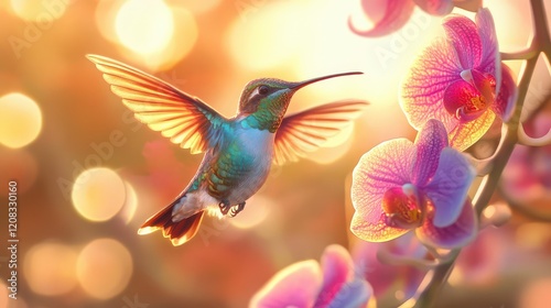 a vibrant hummingbird hovering near an exotic orchid at golden hour, iridescent feathers catching light, detailed digital painting with bokeh effects and delicate motion blur