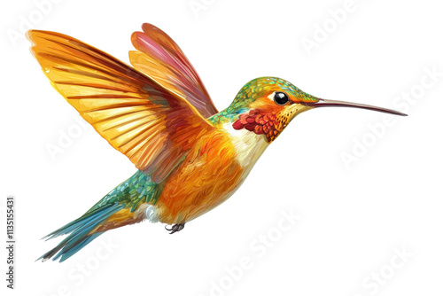 A vibrant hummingbird in mid-flight, showcasing its colorful plumage and elongated beak.