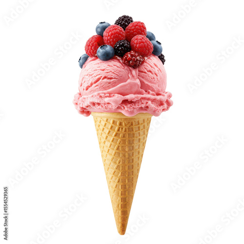 A vibrant ice cream cone topped with fresh berries, set against a simple background