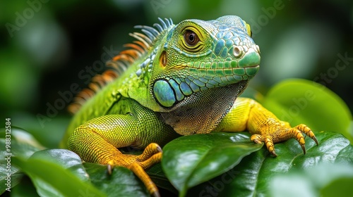 A vibrant iguana resting on lush green leaves in a tropical setting.