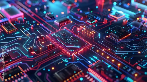 A vibrant, illuminated circuit board with glowing lines, chips, and connectors, featuring intricate patterns and a futuristic aesthetic in bright neon colors.