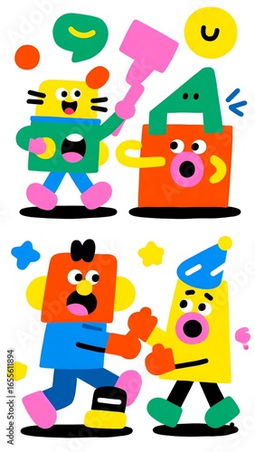 A vibrant illustration featuring playful cartoon characters with geometric shapes and a cheerful color palette. Perfect for fun and creative projects.