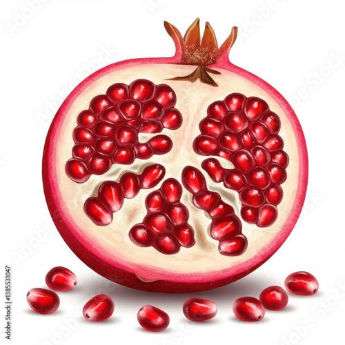 A vibrant illustration of a halved pomegranate with scattered seeds on a white background art