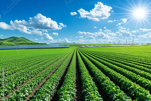 A vibrant illustration of sustainable agriculture, showing renewable energy sources powering vast crop fields