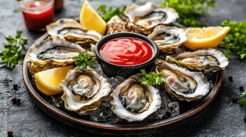 A vibrant image of a platter of fresh oysters on the half shell, served with lemon wedges and cocktail sauce.