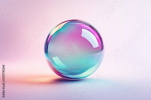 A vibrant, iridescent glass sphere reflects light, showcasing its translucent and colorful nature.